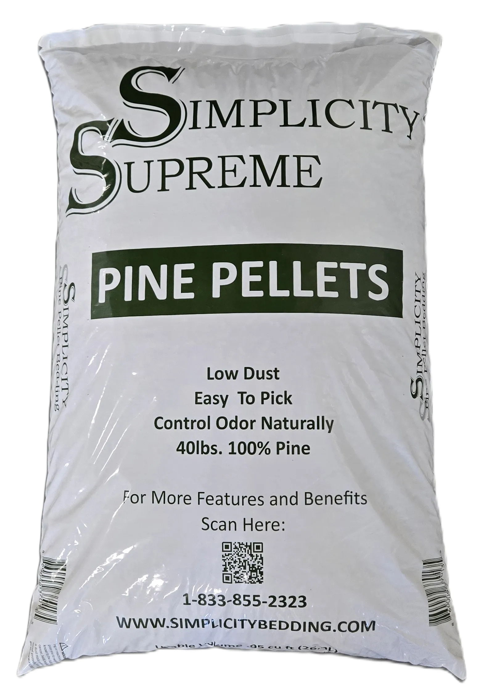 Simplicity Supreme Pine Pellet Horse & Livestock Bedding is produced from all-natural, kiln dried pine without chemical additives, fragrances, or binders. Unlike other producer, dust is extracted through a multi-tiered screening system prior to pelleting. This proprietary system provides a specifically sized particle for palletization. Airborne dust has been eliminated and once the pellet is softened in the stall, provides a much more durable and longer lasting bedding under hoof. You will find a supportive cushion and highly absorbent foundation suitable for stalls or trailers.